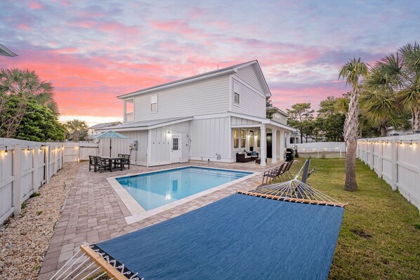 Outdoors, the private pool extends across a spacious back patio with ample loungers, offering a refreshing place to unwind throughout the day. The covered patio features plush seating and a grill, creating a welcoming spot for outdoor meals or time spent in the shade. Public beach access at Whale’s Tail and Pompano Joe’s can be reached in about 5 minutes using the complimentary 6-passenger golf cart (LSV), with walking access also available. Coastal Empress is close to popular spots such as The Crab Trap, Surf Hut, and the shopping at Silver Sands Premium Outlets, rounding out a stay close to the dining and experiences that make Miramar Beach a favorite destination.