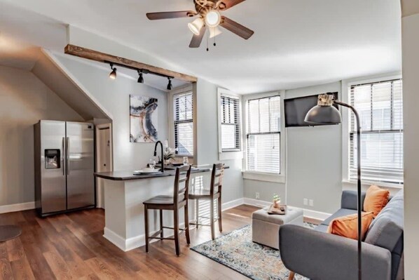Apartment 4 is on the upper level of the home. Again, some guests have mentioned the stairs might be a little steep. There is one bedroom with a king-size bed as well as a single. There is also a sleeper sofa in the living room and a large flat-screen TV. Guests will enjoy the well-appointed kitchen with updates throughout.