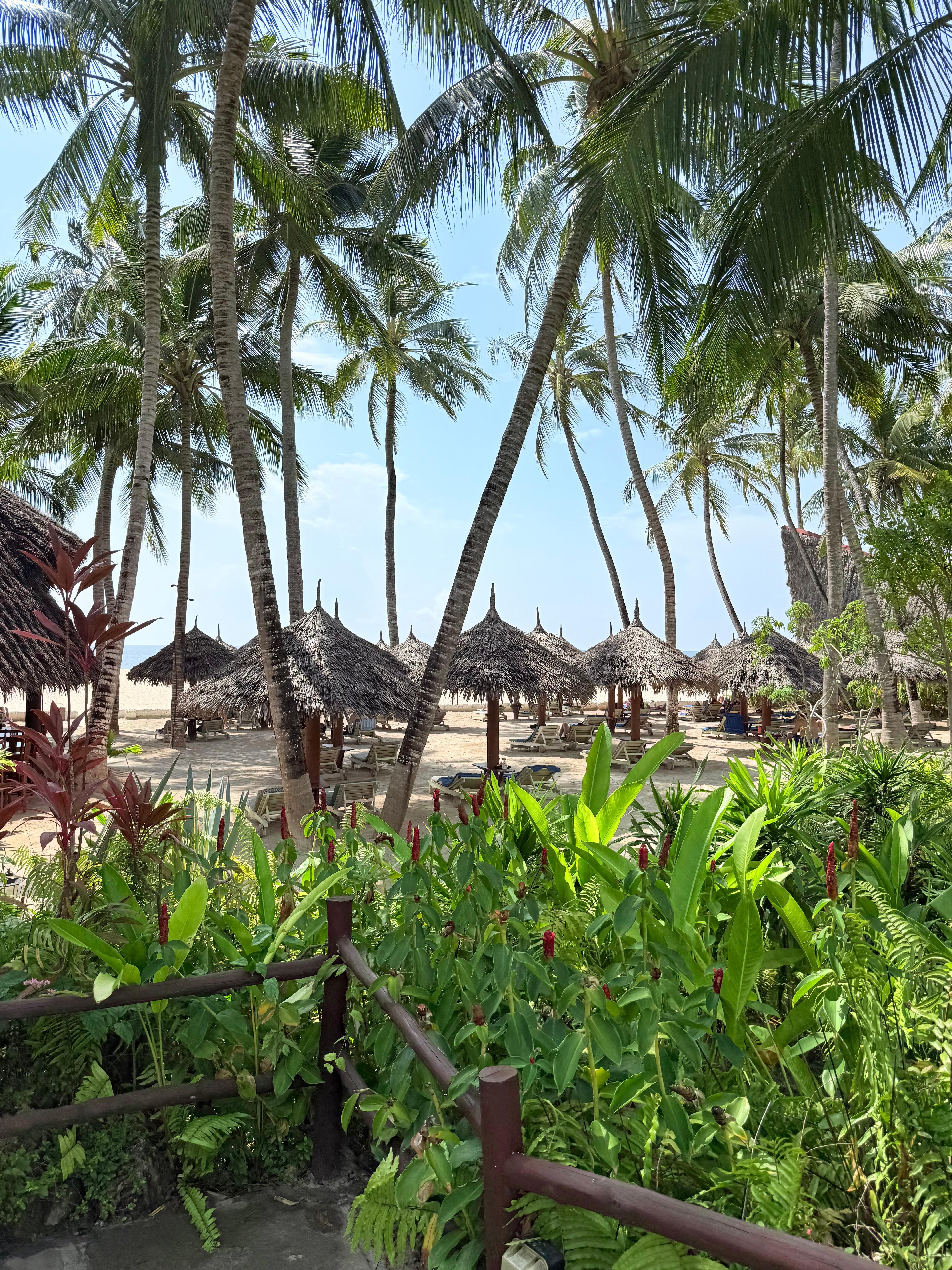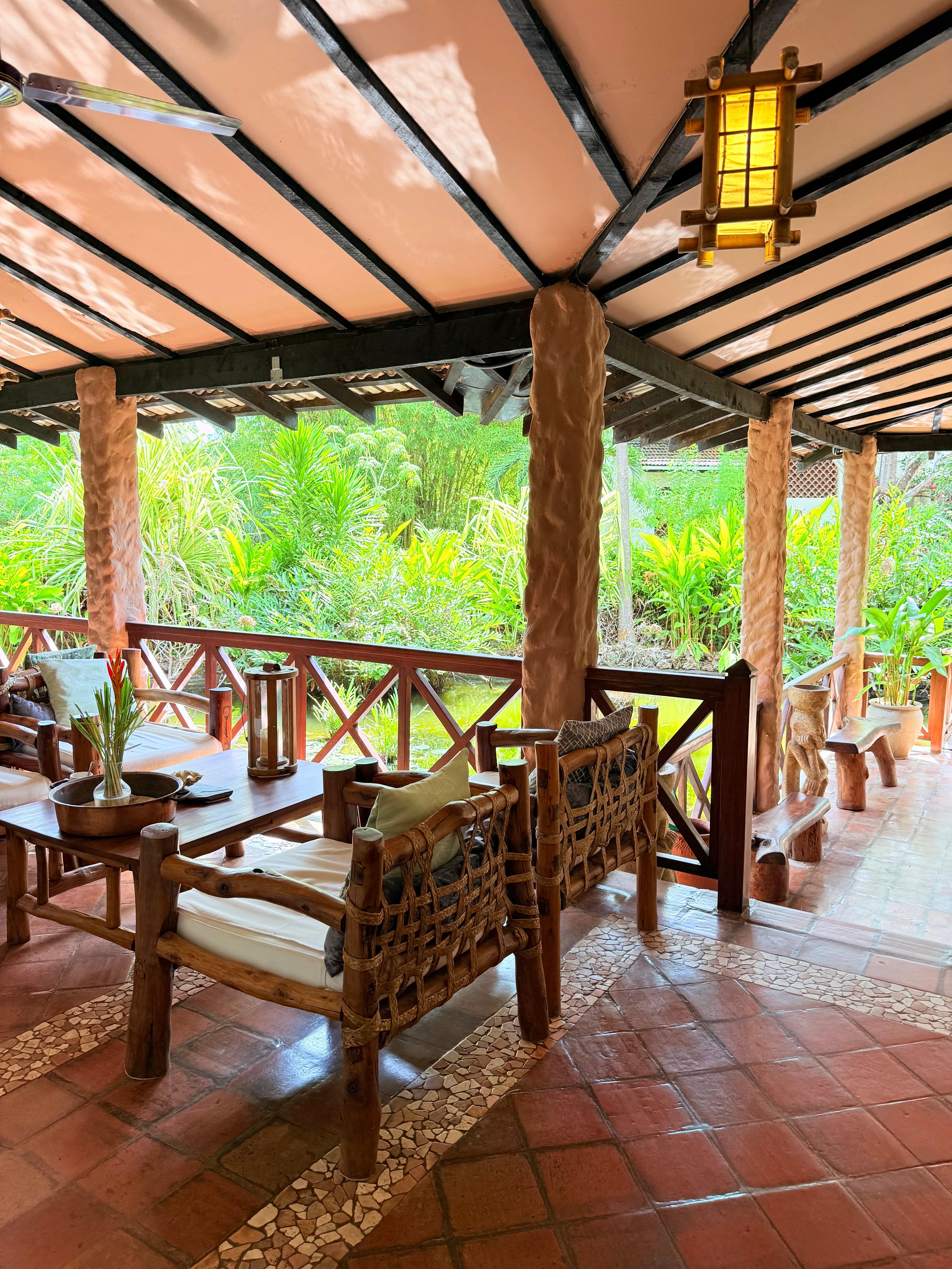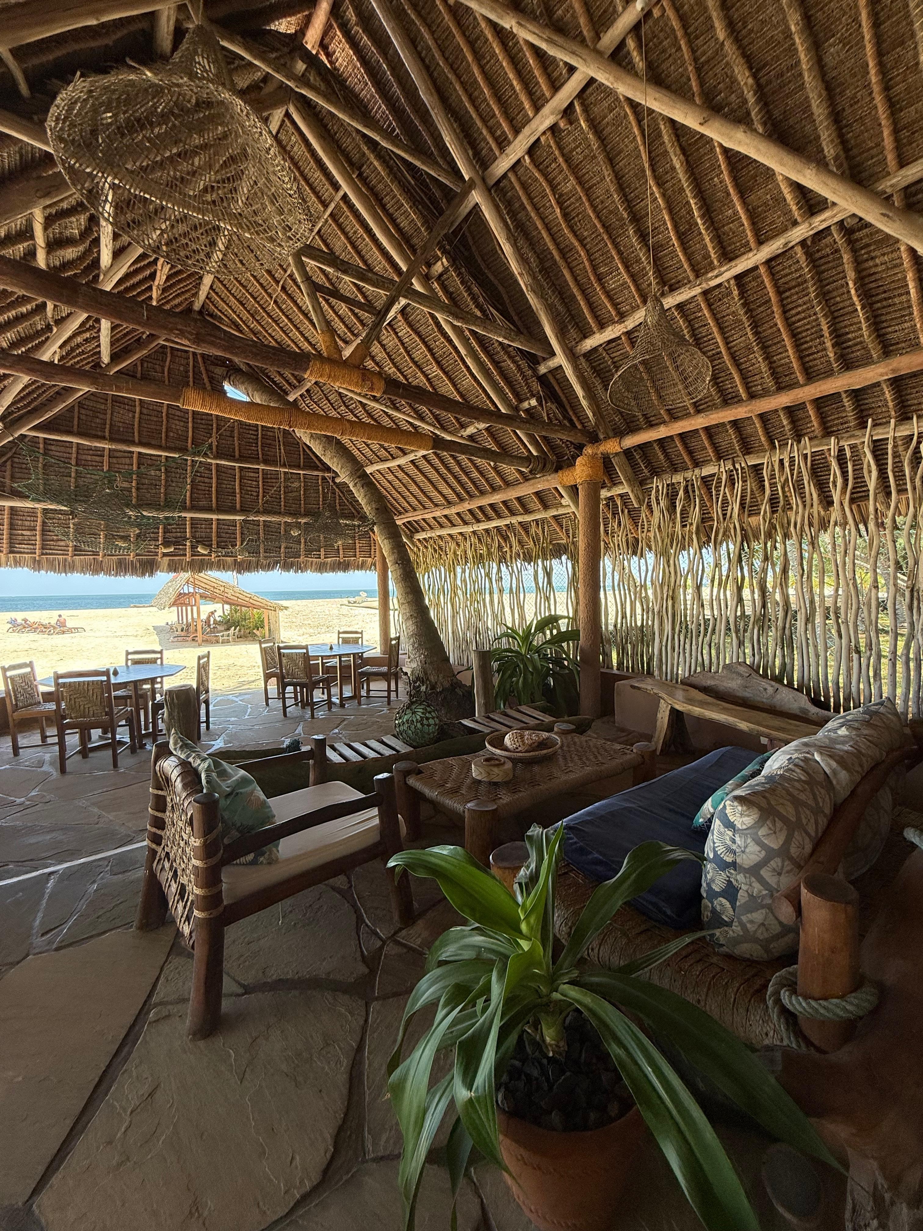 On the beach, lush foliage, relaxing atmosphere, good food.