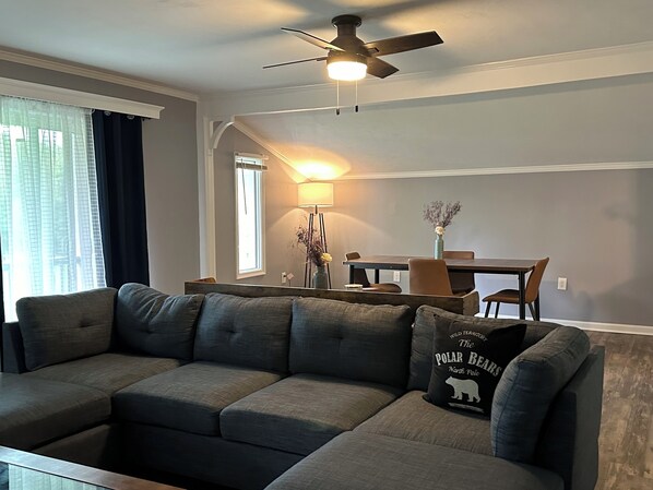 The house features 3 spacious bedrooms and 2 full baths, providing comfortable and private lodging for up to 8 guests. It is equipped with modern amenities including fully stocked kitchen, Wi-Fi, entertainment systems, full washer and dryer, board games, foosball/air hockey combo game table set, cozy living room with separate dining room.