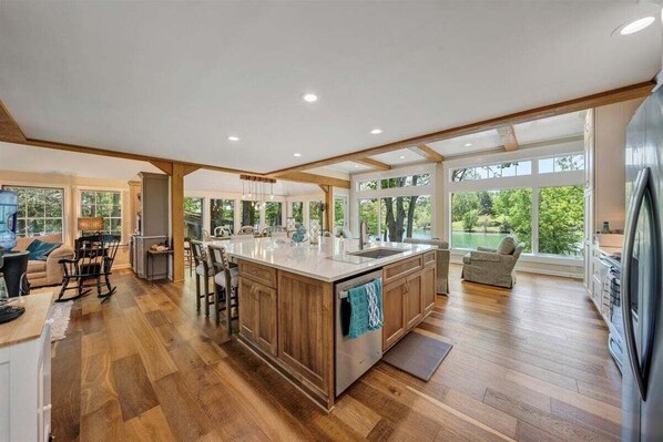 After a day on the water, unwind in the hot tub overlooking the lake, curl up with a book in one of the cozy seating areas, or enjoy a family game night in the open living space filled with natural light.