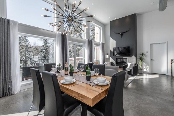 On the ground floor, a spacious kitchen and a fully equipped walk-in pantry for everything you will need for cooking. Large dining room and living room with fireplace providing a warm atmosphere. The chalet is also equipped with central air conditioning, heated floors, Wi-Fi and television to ensure your comfort.