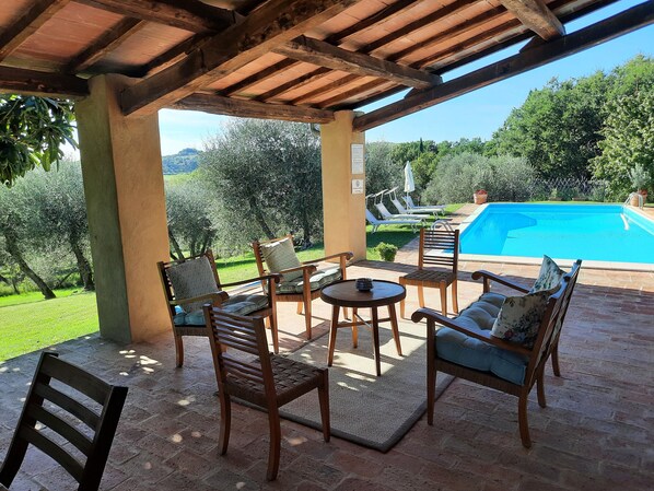 POOLHUS: Ligger i fronten av bassenget, på siden av huset, er et annet utendørs oppholdsrom som inkluderer en loggia med et stort bord som har plass til 10 gjester. Bassenget ligger i hagen med en asfaltert omringet møblert med solsenger og parasoller. Vannet kan nås ved stigetrinn, og det er en overbygd terrasse med bord og stoler bare noen få skritt unna. Bassenghuset har et bad med dusj. Bassengstørrelse: 10m x 6m, 1. 2m - 2. 5m dyp. Bassengområdet er inngjerdet.
