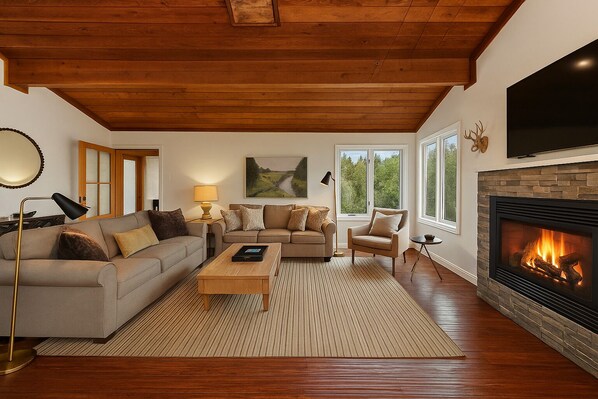 For outdoor enthusiasts, hiking trails and beaches are within reach, while wine lovers will delight in the proximity to the renowned Russian River Appellation. This beautifully modernized home delivers amenities such as a fully equipped kitchen, two gas fireplaces, a wine fridge, canoes, kayaks, and high-speed wifi, making it an ideal space for both relaxation and remote work.