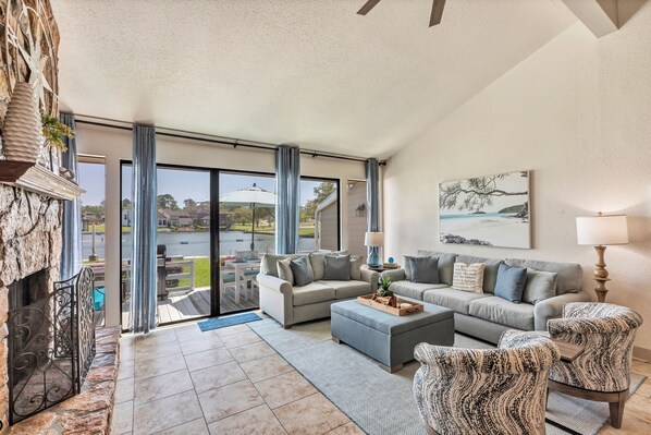 Denne nylig ombygde leiligheten ligger ved sjøen med vakker uhindret utsikt over innsjøen Conroe og country club golfbanen. Fisk rett utenfor leiligheten på den private April Point South boardwalk. Brett opp stoler og fiskestenger og litt takle for enkelhets skyld. Nyt moro moro på det store, store gressletteområdet. Corn hole spill, stige spill, flyter med en oppblåsbare, alt for å sikre at ditt opphold er fullt av familien minner!