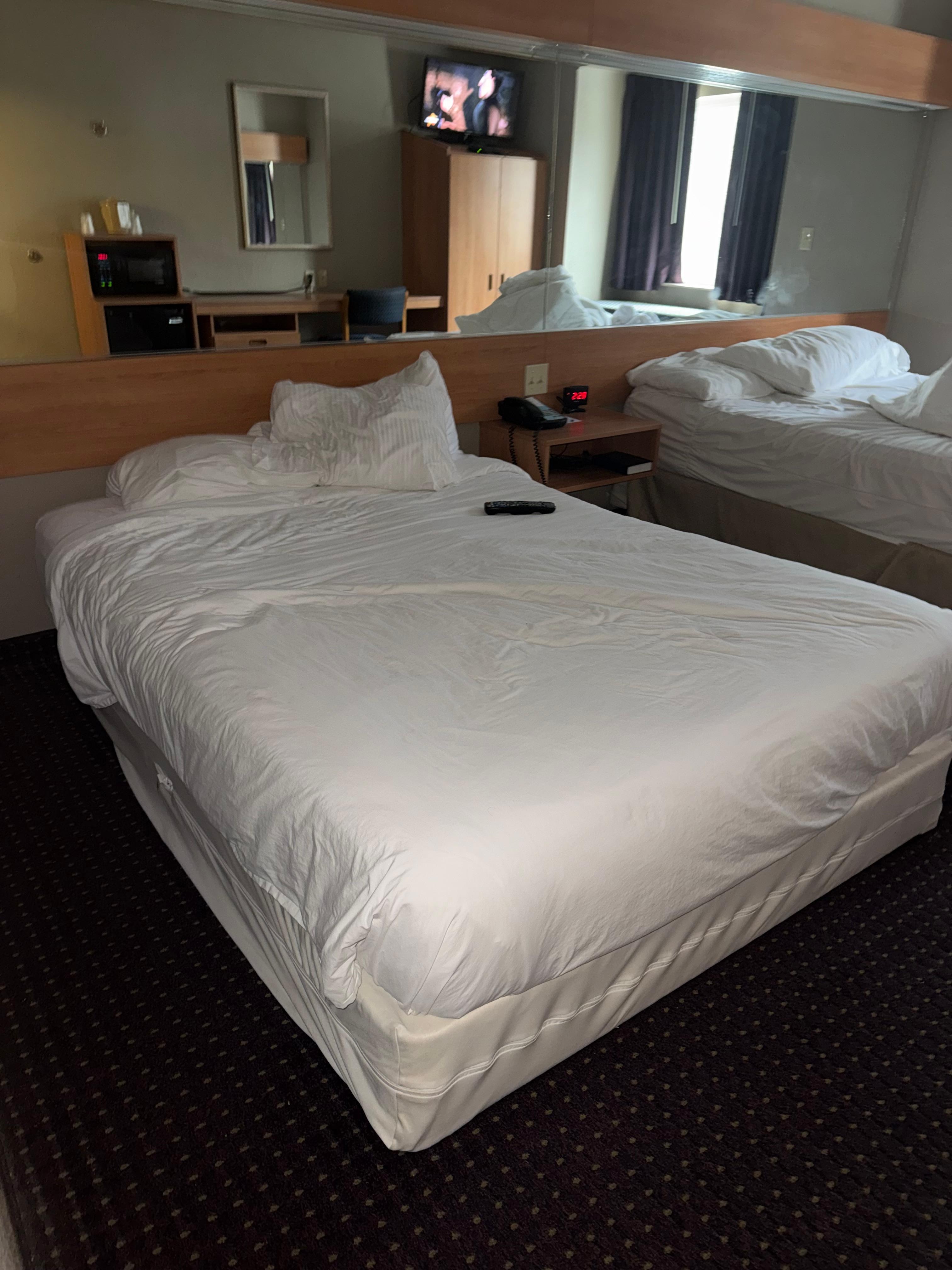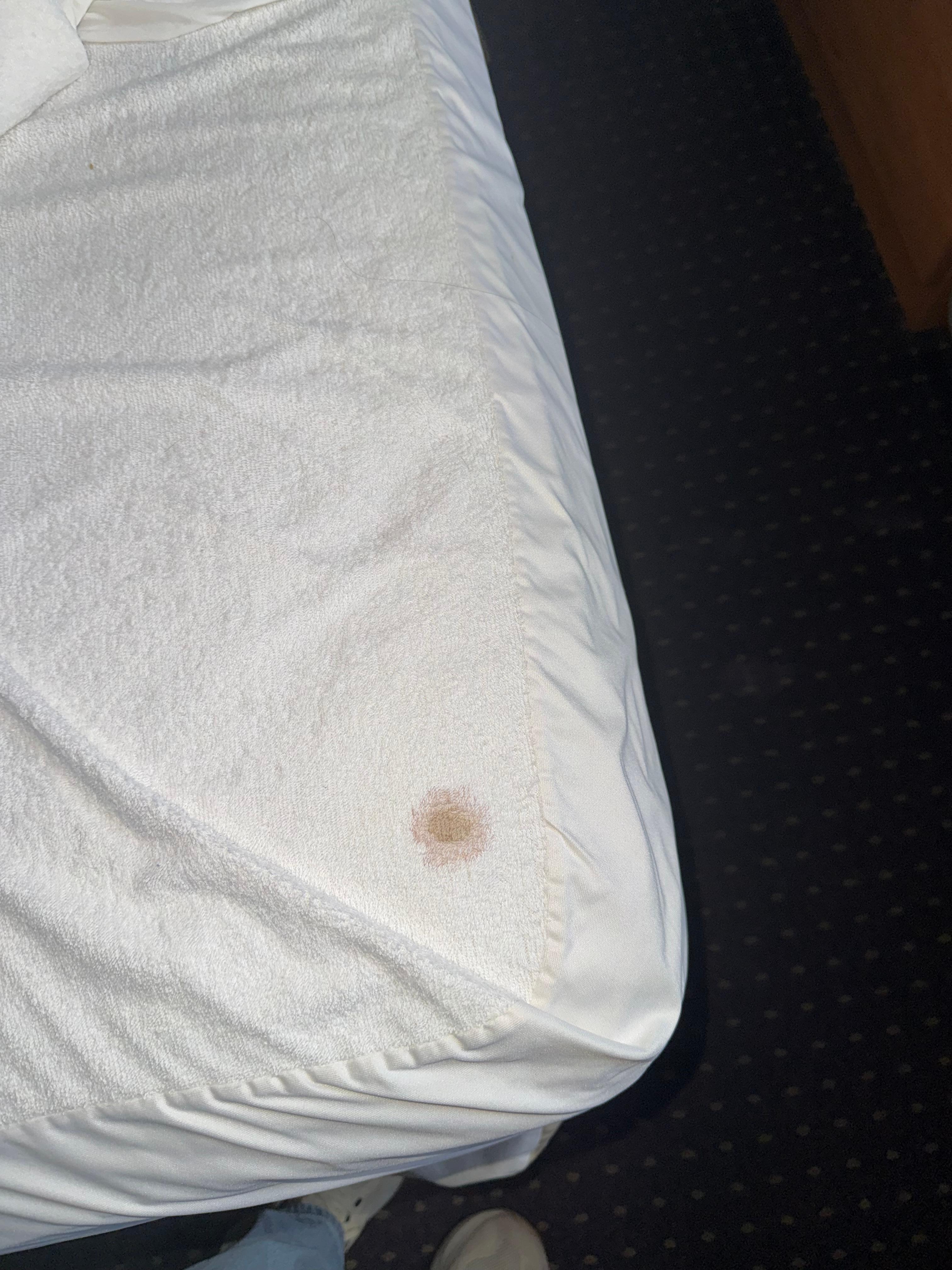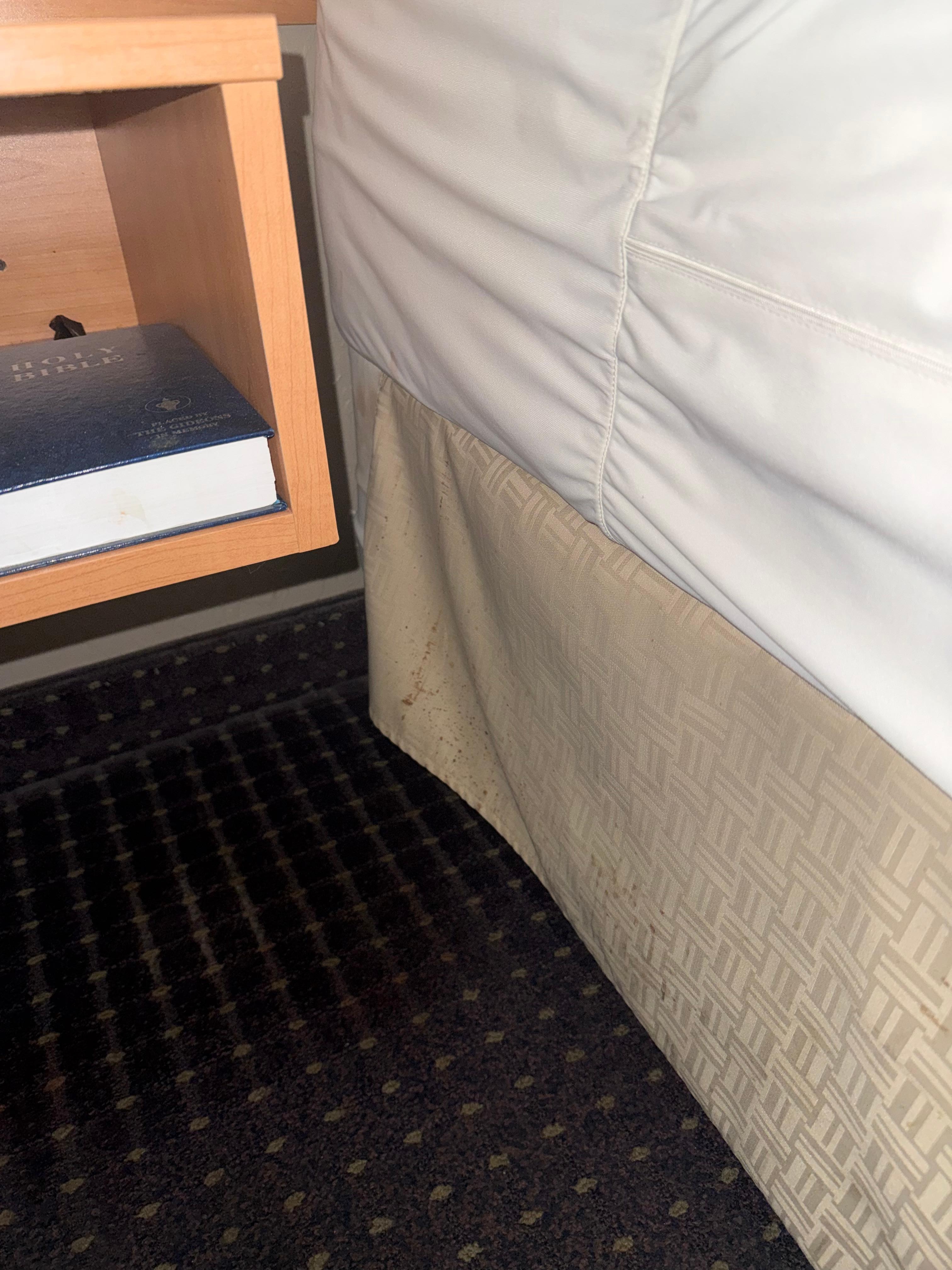 Upon arrival, we noticed multiple issues that should have been addressed by housekeeping. There were visible stains on the bedding that appeared to need proper laundering, and we found hair in the room that was clearly not ours. The shower curtain showed signs of mold, and the bathroom floor did not appear to be thoroughly cleaned.