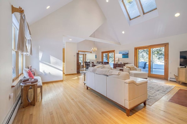 The house has many large windows, tall ceilings, and skylights that allow a ton of natural light to come in and helps make the home feel very spacious!