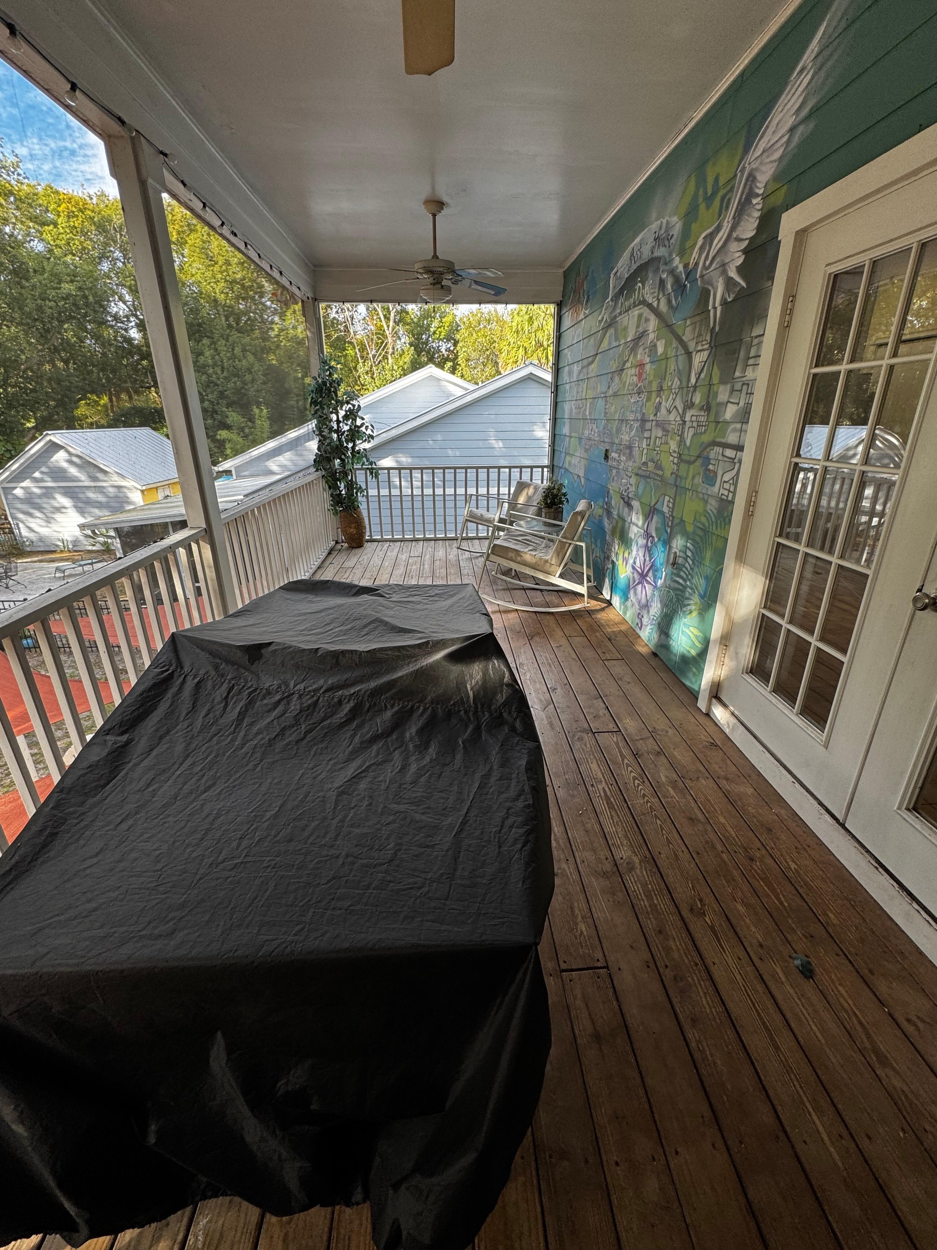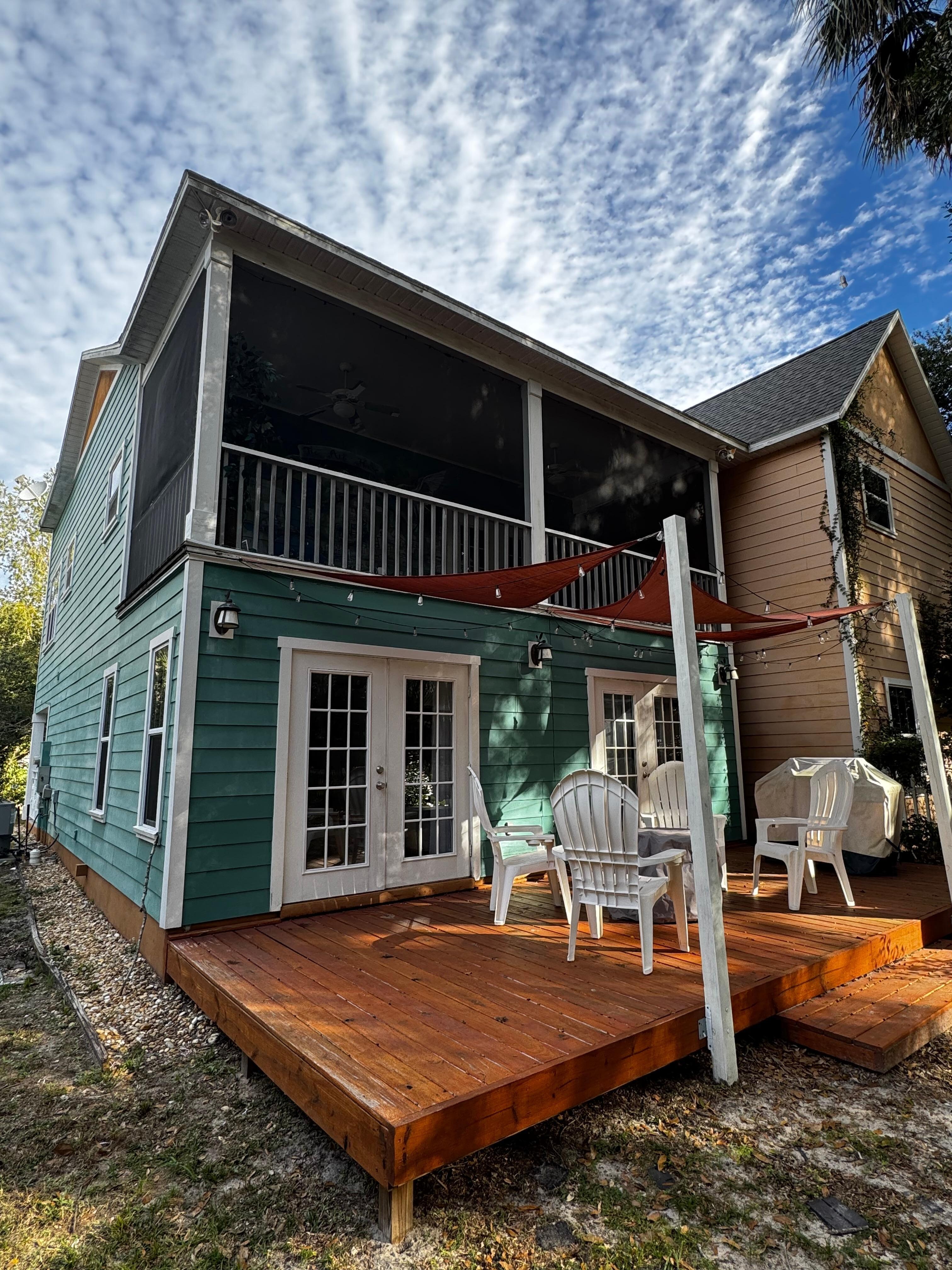 The open kitchen and living room are also located upstairs, with French doors leading out to the charming upper screened-in deck.