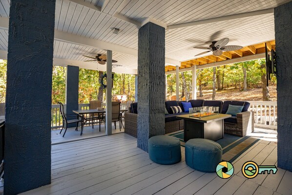 This property has a propane gas grill, a propane Blackstone flattop grill, two propane fire tables, and a stainless steel smokeless fire pit.