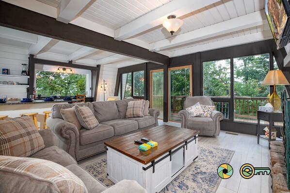 The cozy main level includes a dining area, kitchen & island bar, cozy living room with a gas log stone fireplace, and comfy seating for six. The sofa converts into a queen-size bed if extra sleeping space is needed. The updated kitchen has classy modern white cabinets, an elegant cooking alcove, stainless appliances, and chiseled-edge leather-touch black granite countertops. The kitchen includes basic cookware, tableware, and a Keurig coffee maker (k-cups provided, but please also bring your own favorite grind). The dining area seats six at the table, another four at the kitchen island, and up to four more at the picture window indoor/outdoor bar. The large picture window opens fully to let the outside in! The main floor also includes a well-appointed half bathroom with a stacked laundry center. Upstairs includes three bedrooms -- all with queen beds -- and two full bathrooms, one of which is part of the main bedroom suite. Sleeps six comfortably, with capacity up to eight.