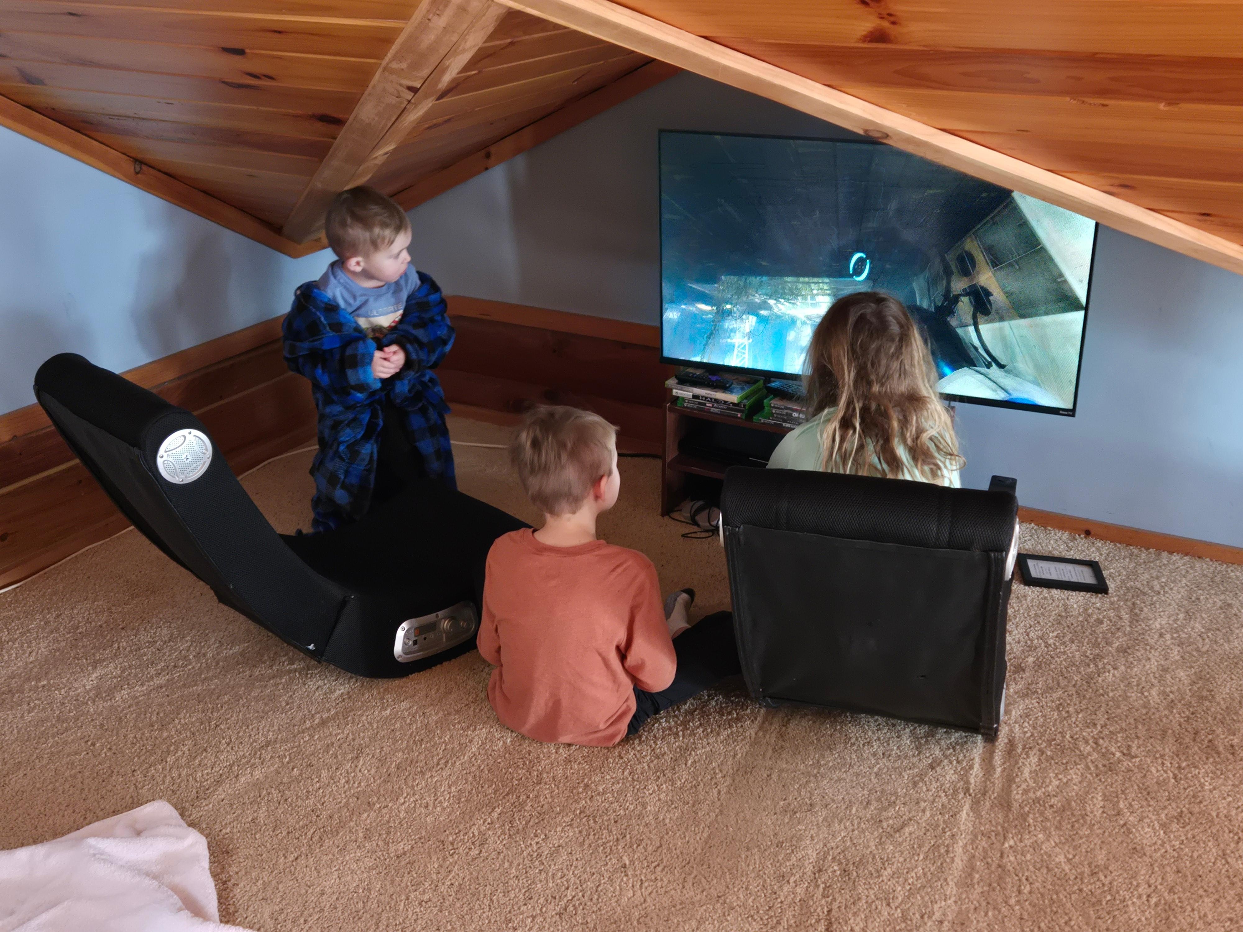 • Loft: The custom wooden stairs lead to an open loft where you`ll find three twin beds, a foosball table, a flat screen TV, gaming chairs, and an Xbox with games —a perfect spot for kids and teens.