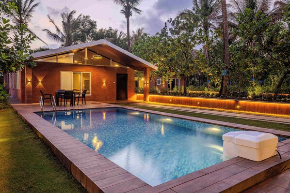 Luksusvilla, terrasse, hageutsikt