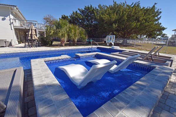 'Game Time' is a 7 bedroom creek home with all the amenities needed for a fun filled vacation in Garden City Beach! The supersize pool area and the stationary walkout pier (no floating dock) are the highlights of this property. The walkout is tucked into a tidal creek that allows for kayaking, paddleboarding and fishing when the tide is right! The public beach access is located a short 10 minute walk, at the end of the road. This home is just off the beaten path, but close to everything! The private pool can be heated for an additional $350 per week (3/1 - 5/30 and 9/1 - 11/1 if air temp is not below 55F).