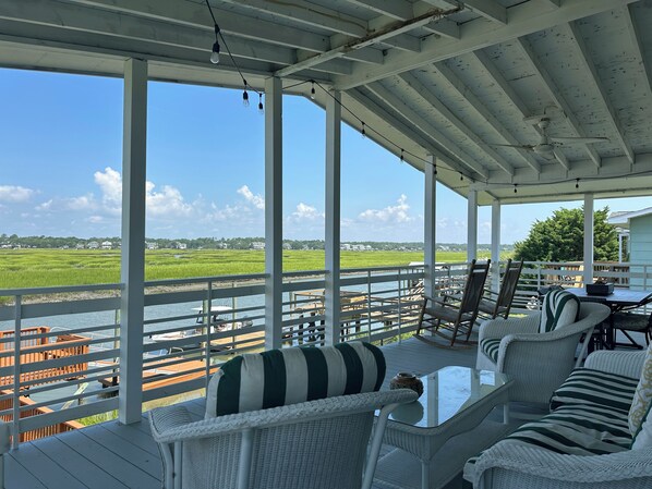 Looking for a vintage cottage with amazing creek views? Gone Fishing is situated on the back of a shared lot, with picturesque views of the inlet throughout the home. Conveniently located across the street from the beach, spend your days having fun in the sun, sand, and surf. Be sure to get back to your private boat dock to watch sunsets over the inlet. The floating dock is the perfect spot to tie your boat up for the week (boat lift not available for guest use), cast a line from, or the more adventurous will use as a swim platform. Head upstairs to the spacious covered porch to relax and unwind and watch the boats go by. After fun-filled days outdoors, go inside to rest and recharge.
