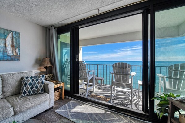 Horizon East Penthouse C is a three-bedroom, three-bath oceanfront condo located 0.6 miles north of Garden City Pier. This ocean facing unit has a fully-equipped kitchen complete with stainless steel appliances including a microwave and dishwasher, and living room with private balcony overlooking the beach, washer, dryer, and central heat and air conditioning. Four TVs (three with cable, one 32-inch Smart TV) and Wi-Fi are also provided. Sleeping accommodations include one king, one queen, and two double-sized beds, plus a queen-sized sofa bed. Common area includes a swimming pool, gazebo, grills and two elevators. Limit two pool gate access passes and one parking pass per unit at check-in. No trailers. No golf carts. No pets. No smoking. Property permits off-season monthly rentals. Maximum occupancy: 9