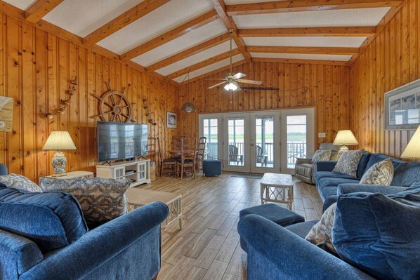 La Haina is a six-bedroom, three-and-a-half bath channel-front home located 2.6 miles south of Garden City Pier and within one block of the beach. This beach house features a large and fully-equipped kitchen complete with microwave and dishwasher, washer, dryer, central heat and air conditioning (upstairs), multi-split system (downstairs), and ceiling fans. Three flat screen TVs, DVD player, and Wi-Fi are also provided. Sleeping accommodations include three king, three queen, and two twin-sized beds. Four bedrooms are located upstairs (two kings, two queen, and one twin-sized bed) and two are downstairs (one king, one queen and one twin-sized bed). There are two private enclosed outdoor showers with hot and cold water and dressing area. The outdoor living space features a screened porch, floating and stationary docks, picnic table, fish cleaning counter with sink, and ample parking (some covered). This property has an inside stairwell. No smoking. No pets. Maximum occupancy: 14