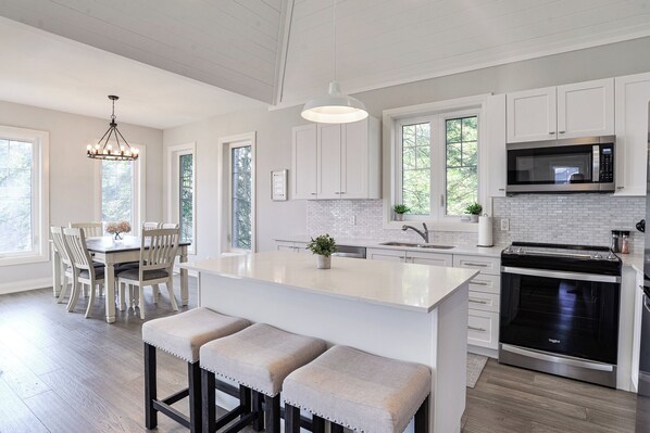Cook up delectable meals in the modern kitchen, equipped with premium appliances and all the essentials you need. The kitchen includes cookware, dinnerware, silverware, cooking utensils, a coffeemaker, toaster, and blender. A BBQ is also available for your grilling pleasure, perfect for outdoor meals.