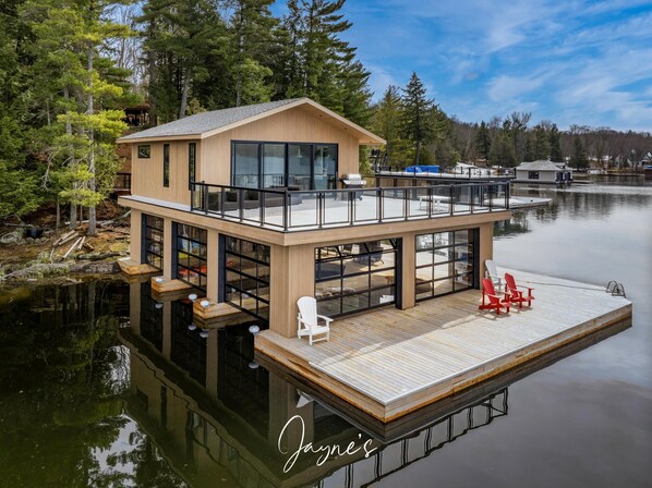 The boathouse is furnished with a new couch, 2 club chairs and a kitchenette with island that seats 5, a fridge, sink, dishwasher and a walkout to the deck. The deck has a teak dining table for 10