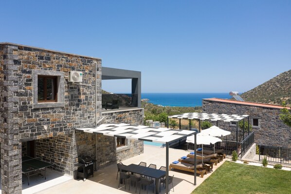 High quality bath towels, pool towels & bathrobes are available • Bathroom Amenities are available • Air-conditioning in all areas is included & serves for heating purposes also • Wi-Fi coverage is available throughout the villa • Bluetooth Dock • Mosquito nets • Outdoor BBQ (Gas) • Outdoor shaded dining area • Indoor area of 145m² • Outdoor area of 550m² • Lawn area of 120m² • Ping Pong table & Playground • Pets are not allowed • Smoking is allowed only outdoors • Events/Parties are not allowed • Pre stock service available upon request • Pool operates seasonally (end of March - middle of November) • 24h/7days ThinkVilla concierge service included.