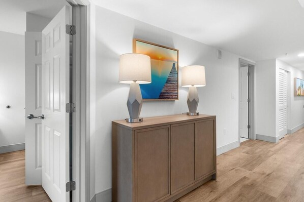 Our Newly Renovated Oceanfront Deluxe Two Bedroom Condo features a bedroom with two double beds and a master bedroom with a king bed, a private bathroom and balcony door. These condos also have an additional common bathroom. Enjoy the inviting living room with a sleeper sofa and a fully oceanfront balcony with breathtaking views of the Atlantic. Each condo includes a full kitchen with a dishwasher, basic dishware and cookware, a six-person dining table, and convenient amenities like a washer/dryer, iron and ironing board, HDTVs, a digital in-room safe, and complimentary Wi-Fi. With 975 square feet of space, these condos comfortably accommodate up to eight guests, perfect for families or groups seeking a memorable beach vacation!