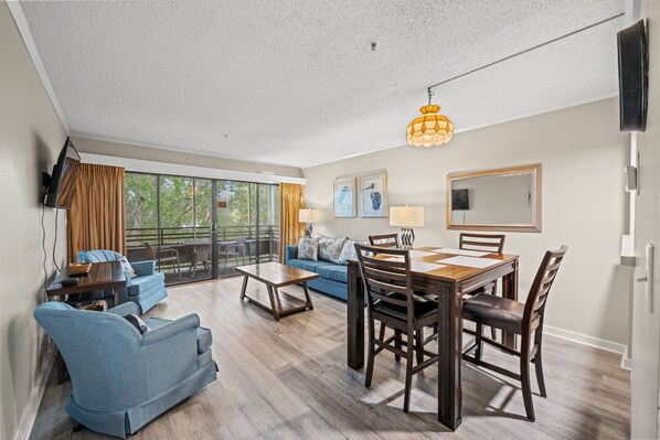 This spacious 1 bedroom, 1.5 bathroom condo is located in the Lodge I building in Ocean Creek Resort. The Lodge I is only about 1/2 of a mile from the beach and the resort offers a free seasonal tram service to and from the beach, that operates every 15-20 minutes. Enjoy all the comforts of home while on vacation. This unit can accommodate a total of 4 guests with 1 queen in the master bedroom and a sleeper sofa the living room. Unit features a fully equipped kitchen, screened in patio and TV's in the living room and bedroom. There is also a coin operated laundry facility onsite.