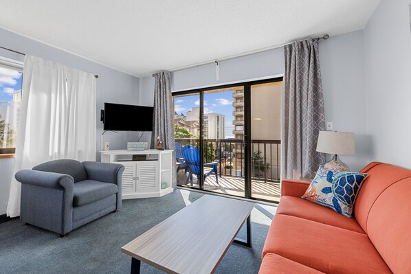 Our spacious living room features a comfortable Murphy bed, providing additional sleeping space for your group. The living room also includes a flat-screen TV and plenty of seating for relaxing after a day at the beach.