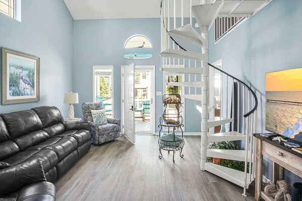 Familierommet har en koselig sofa, hvilestol og avslappende stol med osmannisk, flatskjerm-tv med en kyststrandfølelse.
