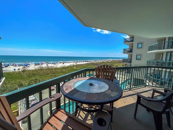 Ocean Bay Club 207 leilighetutleie tilbyr et romslig stue med en skyvedør som åpner ut mot oceanfront balkongen. Det fullt utstyrte kjøkkenet har nok av alt du trenger for å tilberede daglige måltider, og har mye diskplass. Hovedsoverommet har en king size-seng, stort privat bad og skyvekontroll som åpner ut mot havet balkongen. Det andre og tredje soverommet har hver en queen size-seng mens det fjerde soverommet har to enkeltsenger. Stuen har en sovesofa for å imøtekomme ekstra sovebehov. Denne enheten kan sove ti personer komfortabelt. Ferie leilighet i North Myrtle Beach 207 har fire TVer (HDTV), to videospillere, en DVD-spiller, gratis internett og en vaskemaskin og tørketrommel. Denne ulastelig, pent innredede leiligheten har en vakker utsikt over Atlanterhavet. Ta deg tid til å slappe av på balkongen ved havet og nyte det varme havbrisen og den naturskjønne utsikten.