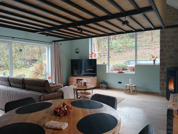 Gjesterom med airconditioning på denne hytta har peis og kaffetraktere/tekokere. Kjøleskap, komfyrtopp, mikrobølgeovn og gryter og panner/tallerkner/kjøkkenutstyr er tilgjengelig på kjøkken.
