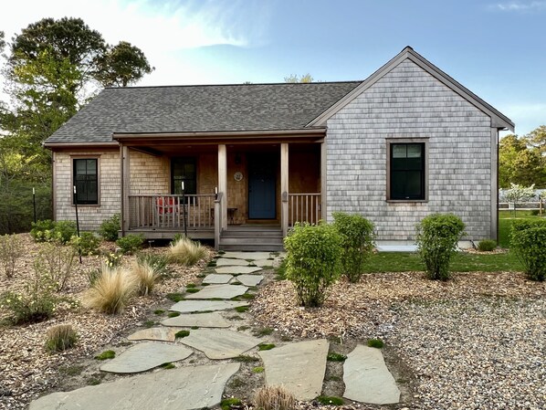 Our Nantucket cottage, “the Beehive”, welcomes you with a farmer’s porch, large back deck with gas grill, fully equipped kitchen with island and 3 stools, open concept living space, dining table for 6, cushy couch, large flat screen tv, fast WiFi, central air conditioning and a beachy vibe, all washed in natural light streaming through large windows and sliding glass door. Each of the 2 bedrooms has super comfy king-sized beds, en-suite bathrooms with exquisitely tiled walk-in showers. Half bath off the entry with fun wallpaper. Step out the back door, off the expansive deck and onto acres of conservation land trails. Have a glorious day at Cisco Beach followed by a stop at Cisco Brewery to meet up with friends and family to hear some live music. Gather your groceries at conveniently close-by farms and fish market. Take an outdoor shower. Play cornhole on the lawn. Read a book in the sun on the deck. Stargaze. Birdwatch. Cook in or head to town to partake in many of Nantucket’s world renowned restaurants. Sun! Fun! Swim! Nap! Food! Music! Bike ride! Games! Relax and enjoy!