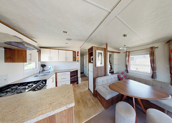 Well presented 12ft-wide caravan with one double and one twin. Shower. Heating throughout. No pets.