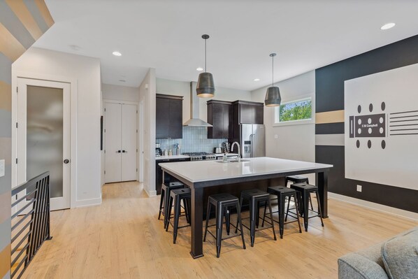 Fully stocked modern kitchen – gas range, stainless steel appliances, and everything you need to cook and entertain