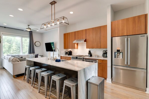 Large island with bar seating—perfect for group meals, snacks, or ordering in.