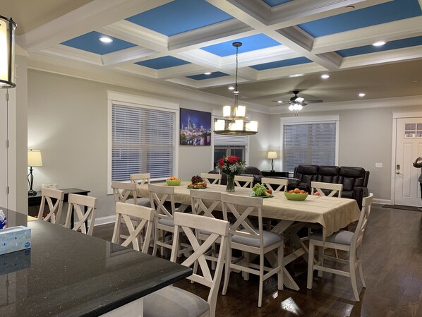 Hovedetasjen sprer seg foran deg med kjekk eikegulv eller flisegulv overalt, inkludert en stor stue, åpent kjøkken, hovedsoverom med en king size-seng og stor balkong nær kjøkkenet og stort dekk i fronten av huset. Et flatt 75 "TV-apparat på toppen av elegant peis; 12 seter mørkebrunt spisebord med fire til når det utvides ligger midt på gulvet; komfortabel seksjonssofa med to liggende seter og tre seter sofa er lagt rundt et salongbord; indre kokk i gourmetkjøkkenet med herlige granittbenker, den enorme galakse-svart granittøya gir ytterligere 4 seter på den ene siden, trendy hvite skap og hvitevarer i rustfritt stål, inkludert komfyr / stekeovn, mikrobølgeovn og oppvaskmaskin.