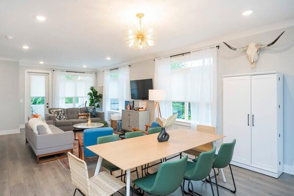 The professionally decorated house is multiple levels with ample bedding for large groups and families. It features an amazing balcony for supreme leisure and downtown viewing. The kitchen has all new appliances and is stocked with basic cooking supplies, dishes, and a coffee maker. The living room is comfy and modern with a flat-screen TV. The entire space is professionally decorated, perfect for your entire group to spend time together during your stay.