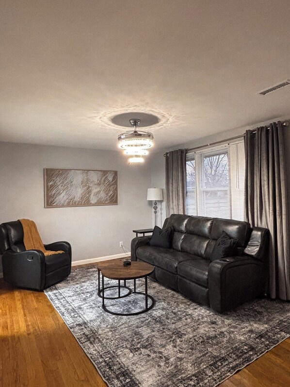 So disappointed. Backyard not as pictured. Piles of brush, tree branches, and Osage oranges in various states of decomposition. We were competing in a dog show and booked this rental so our dogs could play and unwind after the competition. Access to the backyard thru a bedroom was ackward. The person staying in the master bedroom had to disrupt the person sleeping in the bedroom if their dog needed to go out in the middle of the night. Also had problems when we arrived. Access code to keyless door lock didn’t work and we had trouble contacting property manager. No contact information provided in check in email if we ran into a problem. Found out battery was failing and lock had reverted to default code. Finally got a key by accessing a lockbox on back door. Information for access to Wi-Fi was also wrong.But the house itself was very nice. It was clean and well stocked. We loved the adjustable sofa in the living room.On our wishlist for a more comfortable stay would be a hairdryer in each bathroom. There was only one and we had to share. We couldn’t find a cutting board in the kitchen. Unfortunately we broke two drinking glasses. One fell out of the dish drainer and broke and the other was found broke in the dish drainer. Not sure how that happened.