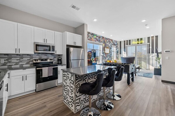 The kitchen area with numerous cooking appliances and spacious countertops is at the top of the stairs. If you want to take a break from the restaurants, then this is the place for you.