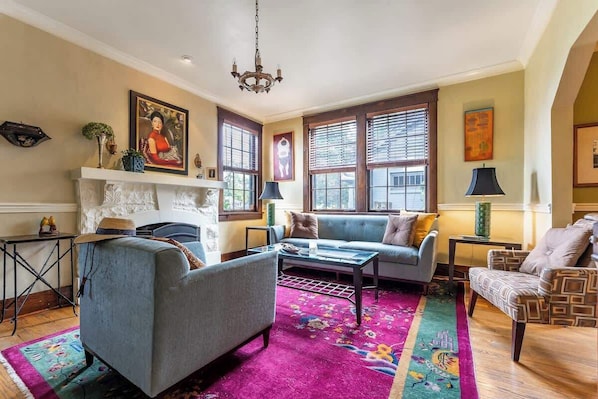 Through the front door, you'll find a sizable living room with tons of natural lighting for your downtime at home in this space.  Connected to the living room is the dining room, followed by the kitchen, laundry room, and back porch area (with full a size washer and dryer) leading to the back yard.  Just off the dining room, you'll also find a hallway leading to the bedroom with a full size bed, an office space (with a pull-out couch for your guests), and the full bathroom.  This home is all on one level with no interior steps.  Please note: This home is 100 years old, so the floors will creak and, at times, there may be a tenant in the upstairs unit. There is a door separating the first and second floor. Please note that the homeowner lives part-time in the upstairs apartment. The two sections of the home are completely separate, divided by a door, so your rental will be 100% private.