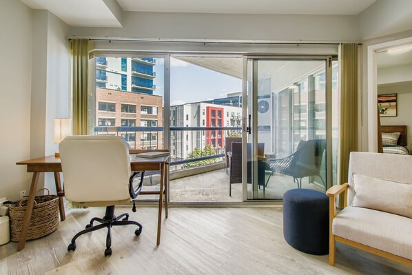 The bright and open living area is perfect for relaxing after a day in the city. Seating area with smart tv for streaming.