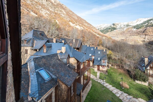 Cosy mountain cabin-style duplex apartment located in the idyllic town of Unha. A very attractive little town with narrow streets and stone houses, where you can find an important gastronomic offer, just 5km from Baqueira and 10km from Vielha.The apartment has a maximum capacity for 6 people, is distributed on two levels. On the first level we find a master bedroom suite with a double bed and bathroom with shower, a bedroom with two twin beds, a second bathroom, and a practical kitchen with a dining area and TV. Going up the stairs, we reach a cosy living room from which to enjoy spectacular views of the mountains, it has a double sofa bed for 2 people. The apartment is equipped with everything you need to enjoy this home during your vacation.The apartment is located in the Eth Verger residential area, located in the square with the same name, at the entrance of the village and in front of the public car park, which makes the location very comfortable as the apartment has no parking space. It has a large and beautiful community garden.Ideal for families and / or groups of friends who want to enjoy a holiday surrounded by nature. Enjoy a safe, personalized stay close to the heart of the Aran Valley and take pleasure in this unique vacation!