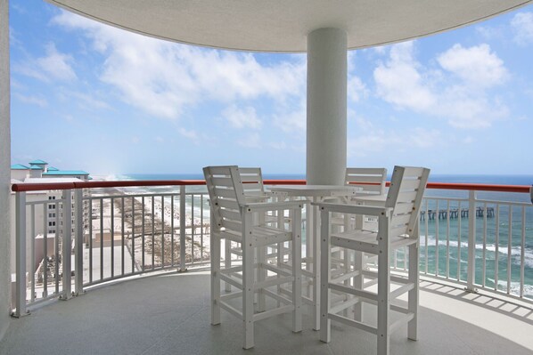 This condo comfortably sleeps up to 6 guests. It is beautifully furnished, all of the amenities of home and more. Beautiful and comfortable living room furniture will make for great evening gatherings. You can enjoy mornings and evenings on one of the most spectacular balconies on Navarre Beach with a full ocean view. This condo has all well furnished bedrooms; 1 King in the primary ensuite, and 2 Full beds in the second bedroom to accommodate everyone comfortably.