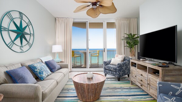 Denne luksuriøse 3 soverom, 2 bad, 1200 kvadratmeter enhet har en balkong med mest panoramautsikt over golfen. Det vakre kjøkkenet er fullt utstyrt med nye hvitevarer og kvalitets kokekar som gjør servering til en fornøyelse. Den nye fullstørrelses vaskemaskinen og tørketrommel i vaskerommet gjør vaskerom en bris. Key pad inngangslås eliminerer behovet for hver person å ta en nøkkel til stranden.