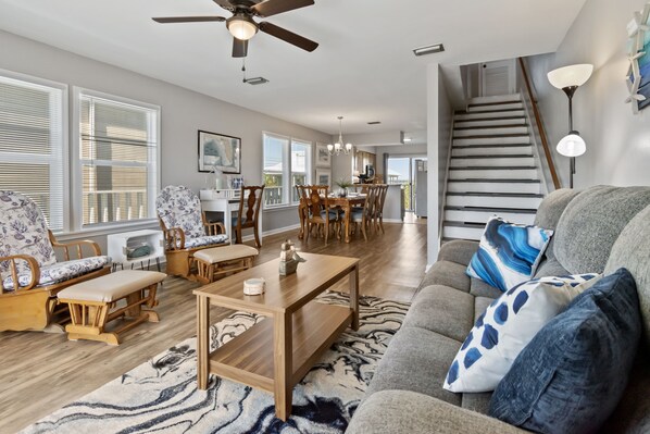 The main floor living room features a large flat-screen TV, dining for 6, and a fully equipped kitchen with everything you need for meal prep. The deck off the living room has Gulf views, while the deck off the kitchen offers a serene view of the Santa Rosa Sound. Both decks are furnished with dining tables, so you can choose the view you want for your snacks and meals.