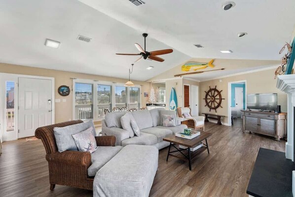 Great place perfect for our family! Nice front and rear porch with ample seating to eat, coffee in the morning or a cocktail in the afternoon. Great view of the canal and enjoyed the sunsets. Easy access to the beach with just a quick drive.