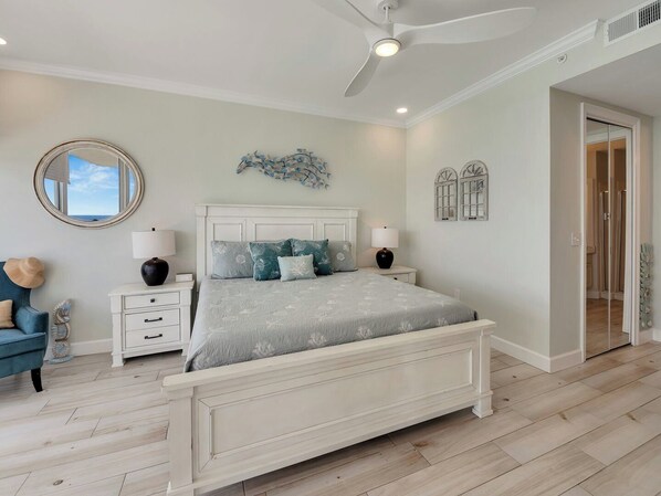 The South-facing master suite is a true haven, with a King-sized Adapt-Cooling Tempur-Pedic bed and a walk-in closet that includes its own beverage fridge. The ensuite bathroom is a spa-like retreat, featuring double vessel sinks, a separate toilet room with bidet, and a walk-in shower with a built-in Bluetooth speaker, letting you enjoy your favorite tunes as you bask in stunning Gulf views. With its elevated 17th-floor position, you'll never have to worry about beach-goers seeing insideyour privacy is assured.