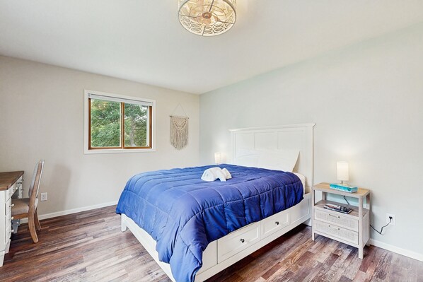 Step inside and be welcomed with fresh linens, basic supplies, and the added comfort of central air conditioning and heating to make your stay cozy in any season. The living room is equipped with cable TV and high-speed Wi-Fi, while the kitchen offers everything you need to cook at home, including a full-size fridge, stove, microwave, dishwasher, and dining space. Step outside to enjoy your morning coffee or grill up dinner on the private patio. After a day of fun, toss your clothes in the in-unit washer and dryer and settle in with one of the provided board games for a relaxing night in.