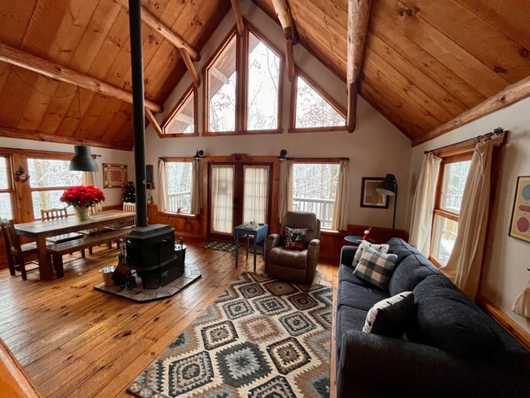 Ligger midt i midten av cirka 8 dekar med tre, finner du Red Hickory. En koselig 1008 kvadratmeter stor hytte med en åpen stue, spisestue og en åpen hems. Denne hytta inkluderer en ny queen size-seng på loftet, med en utfoldbar futon og en utfoldbar sofa for å sove 1 par eller en liten familie komfortabelt. Kjøkkenet er fullt utstyrt med servise, kjøkkenutstyr og gryter og panner for nettene du vil lage mat "hjemme" og kose deg foran peisovnen. Skal du grille ?? To GRILLER er tilgjengelige for deg enten du liker kull eller bensin, du kan velge!