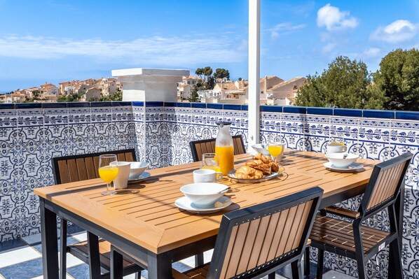 Fantastic private terrace with sun from morning to sunset, perfect for dining or unwinding.