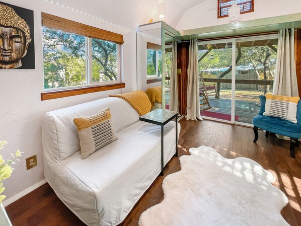 Tucked away på baksiden av vår 4 hektar stor eiendom og midt i all action i Texas Hill Country ... er denne ferske, nyoppussede hytta en varm og moderne plass perfekt for singler, par og små familier. Leveres med alle grunnleggende fasiliteter, inkludert vaskemaskin / tørketrommel / kjøleskap / kjøkken / håndklær, etc. KUN 4 MINUTTER FRA DEN BESTE SVØMSPOTEN PÅ CANYON LAKE og den vakre Guadalupe Spillway ... pluss 1 minutt fra Canyon Lake Dam og en fantastisk båtstart med rikelig med parkeringsplasser. (Båtparkering tilgjengelig på forespørsel - vennligst ring på forhånd).