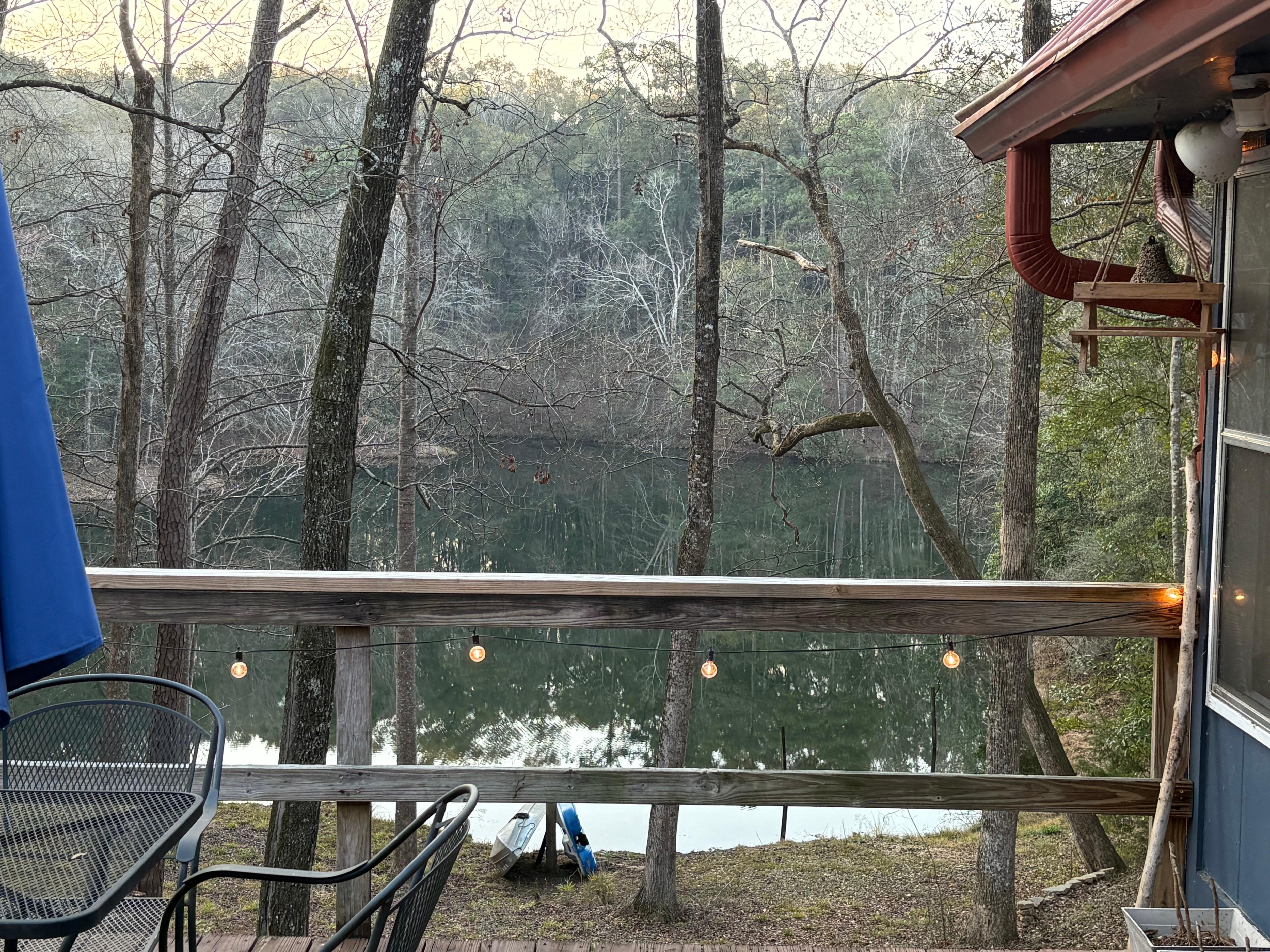 Welcome to the lake house! This unique and tranquil escape has everything you need for an enjoyable time away from home. Featuring two private bedrooms and 1.5 baths. There is a sleeper sofa in the living room with a memory foam mattress and a trundle bed in the flex room that pops up into a king. Primary loft bedroom features a King size bed and half bath. Downstairs bedroom features a queen and adjoins the main bathroom. The living room features a 75” tv, electric fireplace, and comfy seating. Dining room is spacious enough for a family meal. Kitchen is fully equipped to cook something delicious. Outside is a place to truly relax. Front deck allows for nature viewing and comfy sitting. The back deck has a grill, and dining area. Out back there’s a wonderful view of the lake. This property is waterfront with direct access to the water. Fishing is allowed but no swimming. Fishing gear is under the back porch for your use! Covered parking is available for up to 2 vehicles.